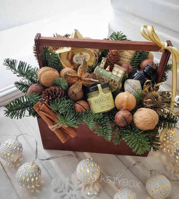 I love this basket. (I couldn't find a shop url for the source, only instagram account.) Here again, no basket; instead a wooden tool box with some tasty tapas, candies, special bottle of their favorite liquor or wine, some nuts glued to skewers, some greenery and Christmas picks, cinnamon sticks, and simple ribbon.
